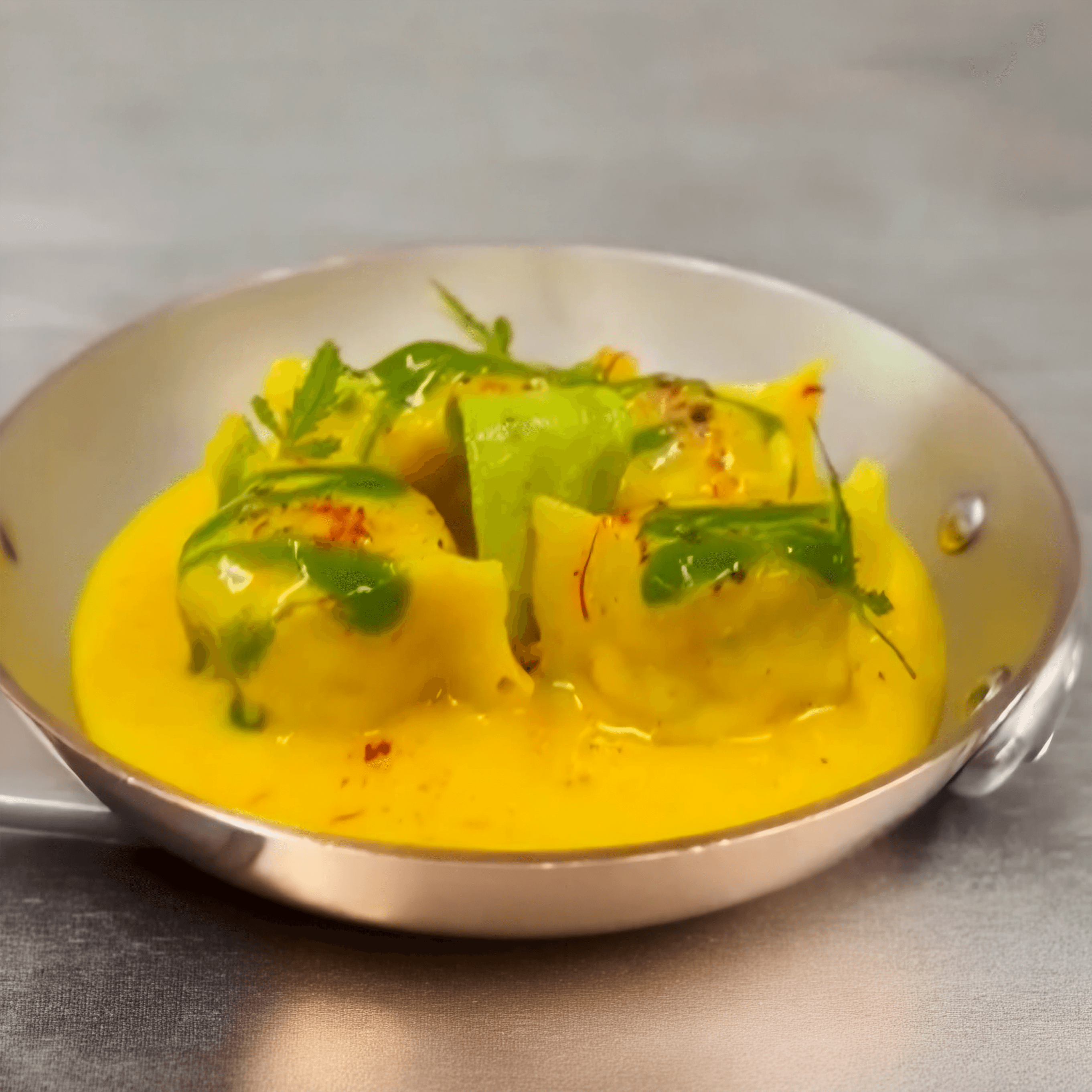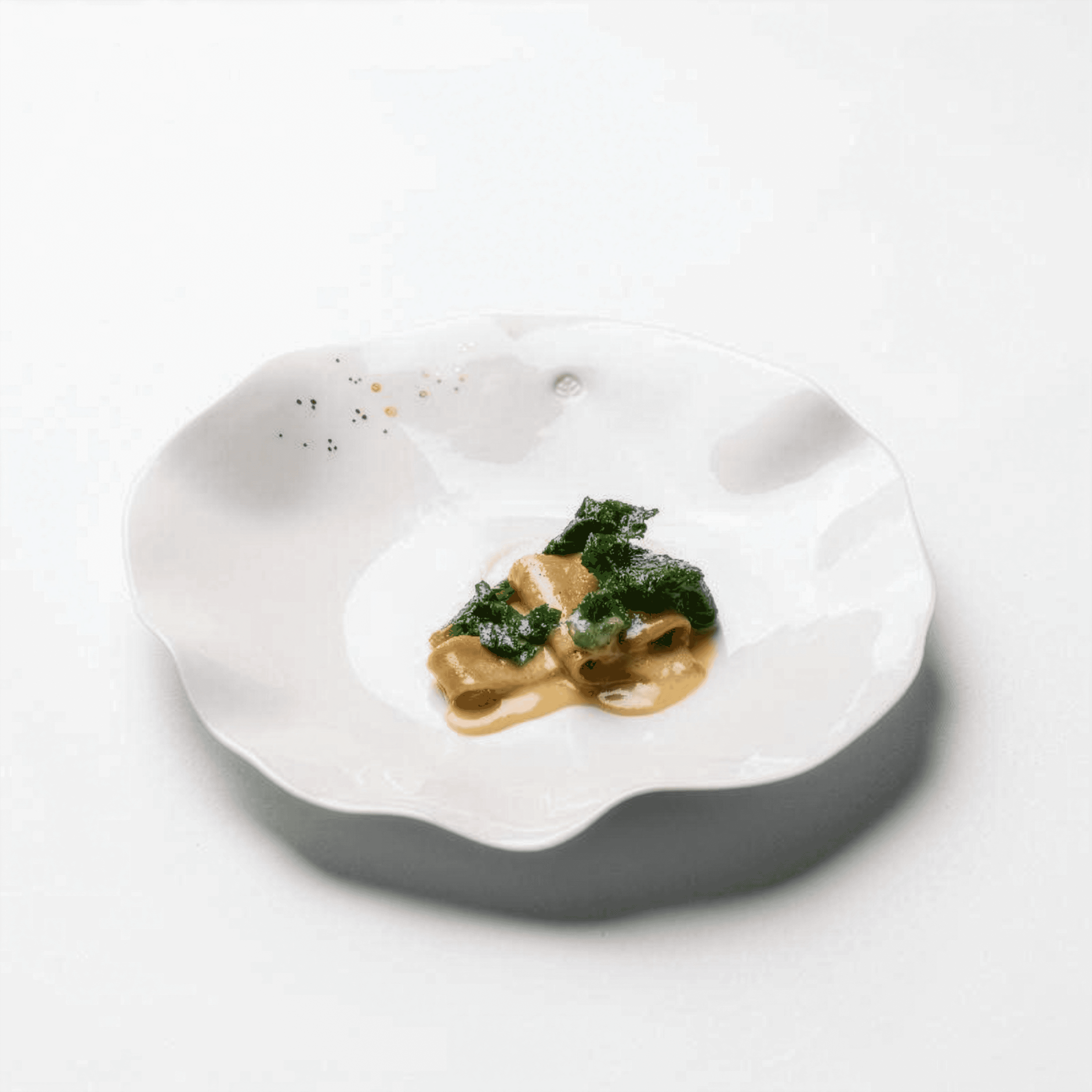 Stendi un velo sottile di beurre blanc sul piatto. Disponi 4 o 5 plin. Aggiungi piccoli punti di pesto tra i plin. Termina aggiungendo una micro brunoise di pomodoro secco, le foglioline di sedano e la zest di lime. Servi con una saucière di beurre blanc, a parte se desideri fare la scarpetta.